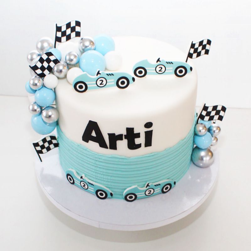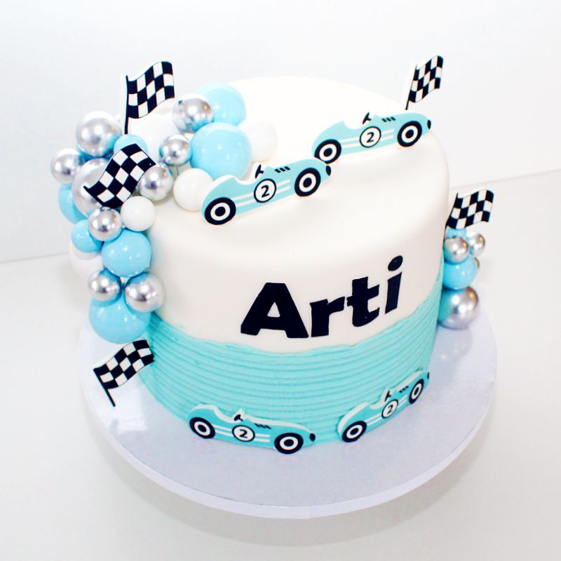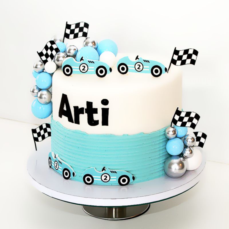 Das Design überzeugt durch sanfte Blau- und Weisstöne, kombiniert mit sportlichen Rennwagen-Elementen, Zielflaggen und glänzenden Kugeln. Das Highlight: Der Name des Geburtstagskindes wird prominent auf die Torte platziert, was sie zu einem ganz persönlichen Unikat macht.